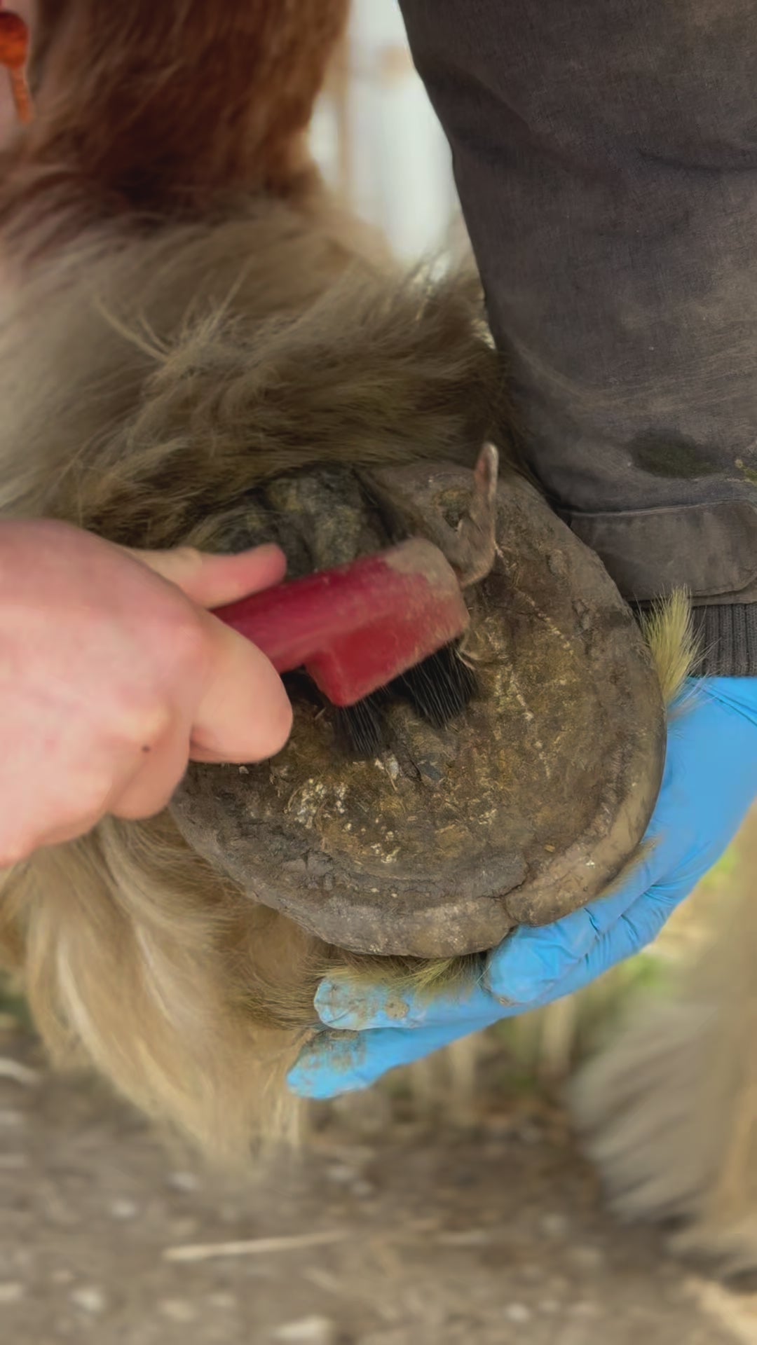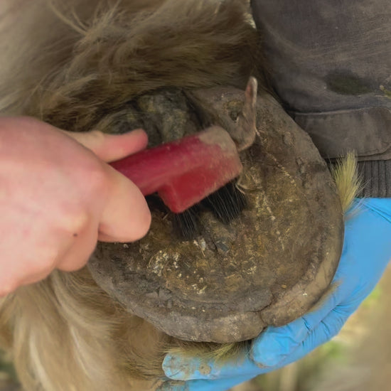 As clay: Spread a thin layer over the sole and frog, working the clay into the collateral grooves and central sulcus. Can be packed over shallow holes and cracks. For very shallow or fine cracks, the clay can be diluted to a thinner consistency with a small amount of tap water to make application easier. Clay is safe to leave in the hoof until it naturally dries and flakes off.